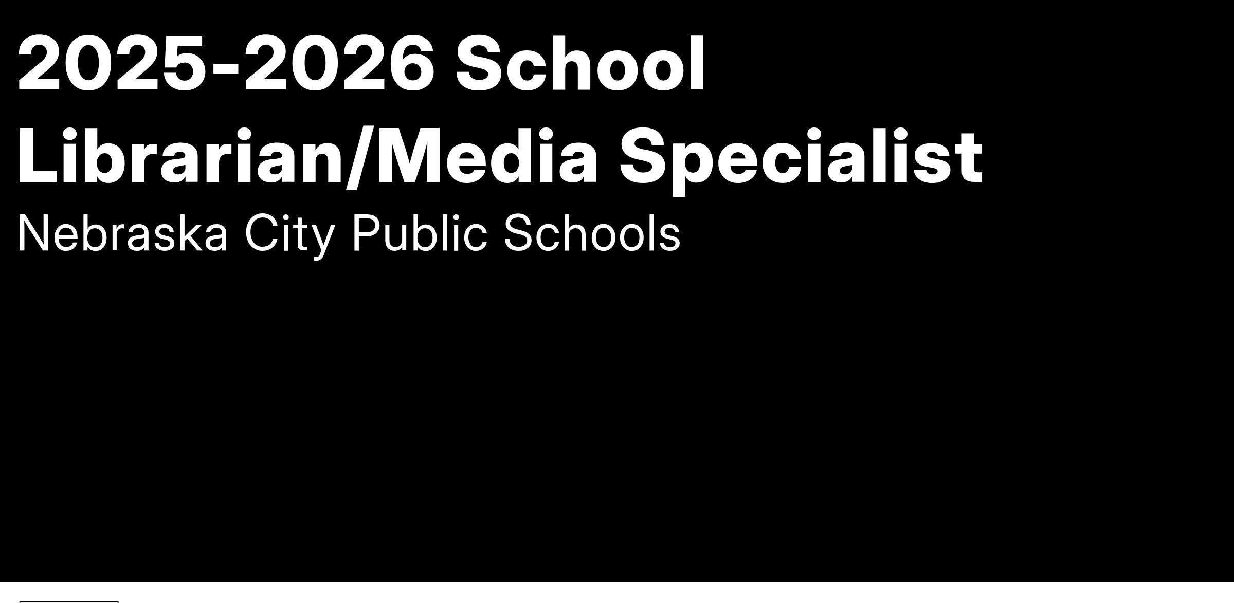 Nebraska City Public Schools is seeking applications for a School Librarian/Media Specialist at Hayward Elementary and Nebraska City HighSchool for the 2025-2026 school year. Applicants must possess or be able to obtain a Nebraska teaching certificate with a School Librarian endorsement. Applications will be accepted until openings are filled. Nebraska City Public Schools is an Equal Opportunity Employer.