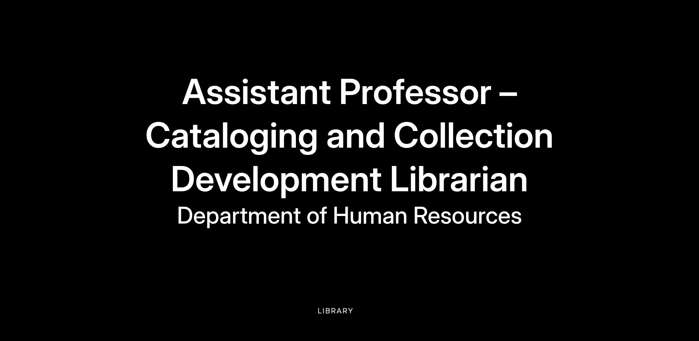 The Assistant Professor and Cataloging and Collection Development Librarian in Library Services has primary responsibilities of cataloging materials as they are received, maintains authority records, ensures the accuracy and integrity of the Library’s catalog, and plans and implements policies and procedures that address needs of the Technical Services Department. This position also scans appropriate reviews and selection tools on an ongoing basis to identify potential additions to the collection, regularly submits orders for materials to the Acquisitions Department, and oversees the collection management and development policies and processes including the subject assessments.