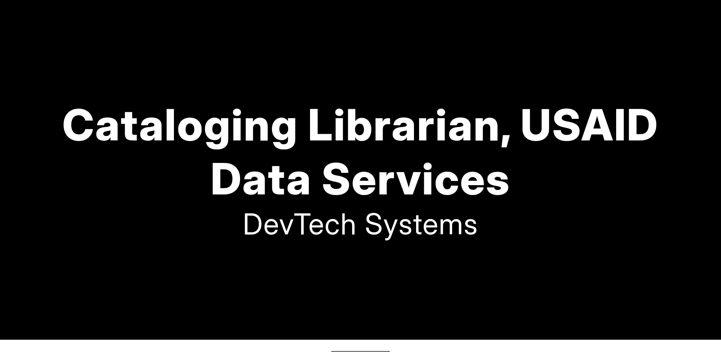 DevTech is looking for a Cataloging Librarian to work as an institutional contractor on its Analytics, Data, Visualization, and Information Services (ADVISE) contract with the United States Agency for International Development (USAID). ADVISE staff comprise much of the USAID Data Services team, led by USAID’s Chief Data Officer (CDO) and situated in USAID’s Bureau for Management, Office of the Chief Information Officer (M/CIO). The Data Services team's main purpose is to improve the usage of data and information at USAID, so that the Agency continues to ensure its development outcomes are supported by evidence. Data Services’ work spans the “data lifecycle,” including planning, collection, cleaning, analysis, curation, reporting, and governance.