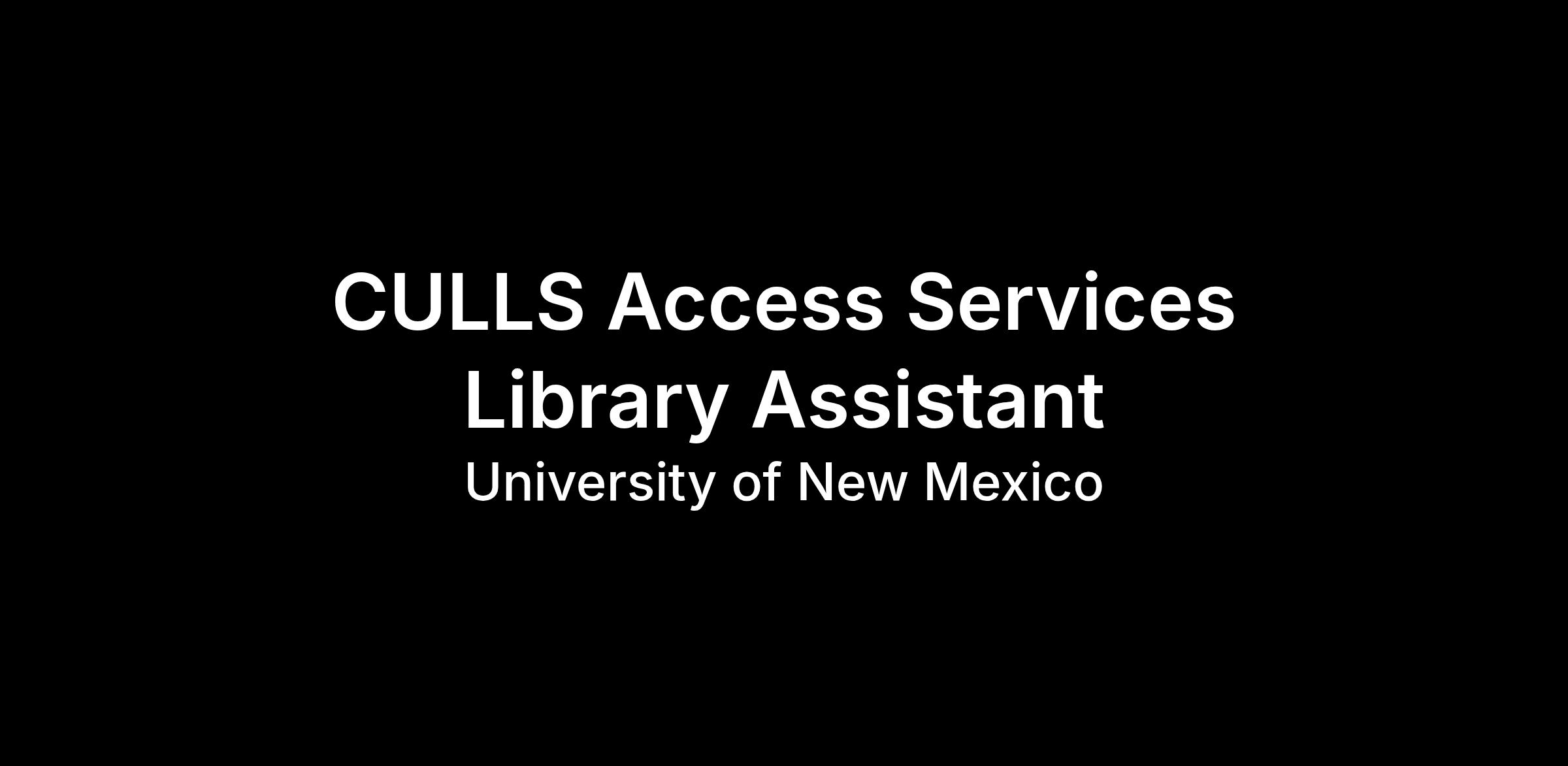 | Position Summary | The University of New Mexico College of University Libraries & Learning Sciences (CULLS) seeks motivated and highly-engaged student employees interested in a challenging and dynamic customer service work environment. Library Assistants are the first point of contact most patrons have with the University Libraries system and take care of most of the day-to-day duties associated with library operations. Under direct supervision, Library Assistants work with University Libraries staff and students in a team environment to: