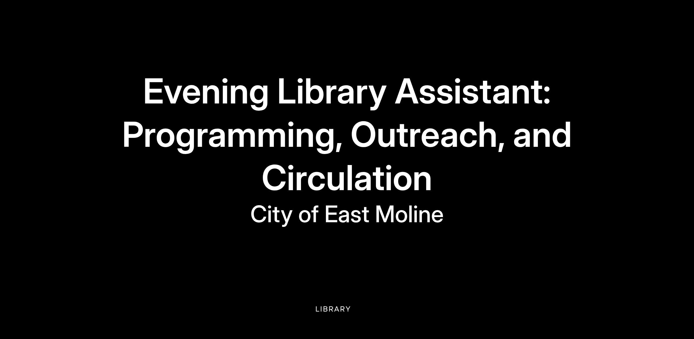The East Moline Public Library is seeking a reliable, adaptable, and positive team-orientated individual to join our Outreach and Programming department as a Library Assistant. The ideal candidate will enjoy working with diverse populations of all ages, is comfortable speaking to various group sizes, and can easily collaborate with others. This position will work evenings until 8pm Monday through Thursday and until 5pm on Friday. They will also be scheduled two Saturdays a month until 3pm.