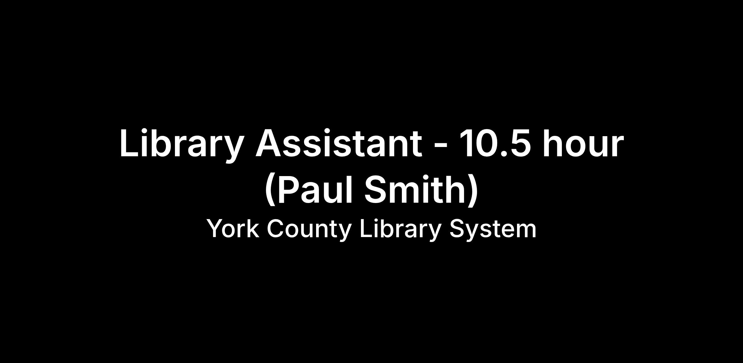 Pay Rate: $9.00/hour I Hours: 10.50 hours per week I Schedule: Wednesday 3:00PM-8:00PM, Saturday 9:30AM-3:00PM I Supervisor: Library Director I Location: Paul Smith Library of Southern York County