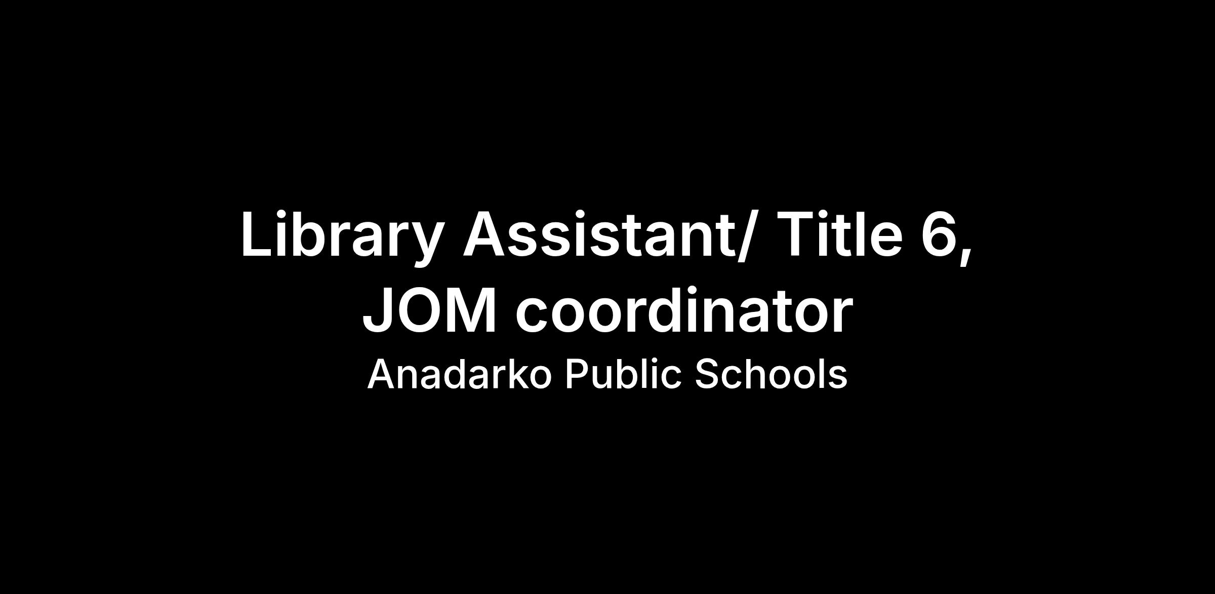 Title 6, JOM coordinator: This position will havevarious duties that fall under Indian Education Department. Help with school supplies. Being the Native Club sponsor. Scheduling meetings with and field trips for the Native American club Members. other duties that the director of Indian Ed and or the principal assigns.