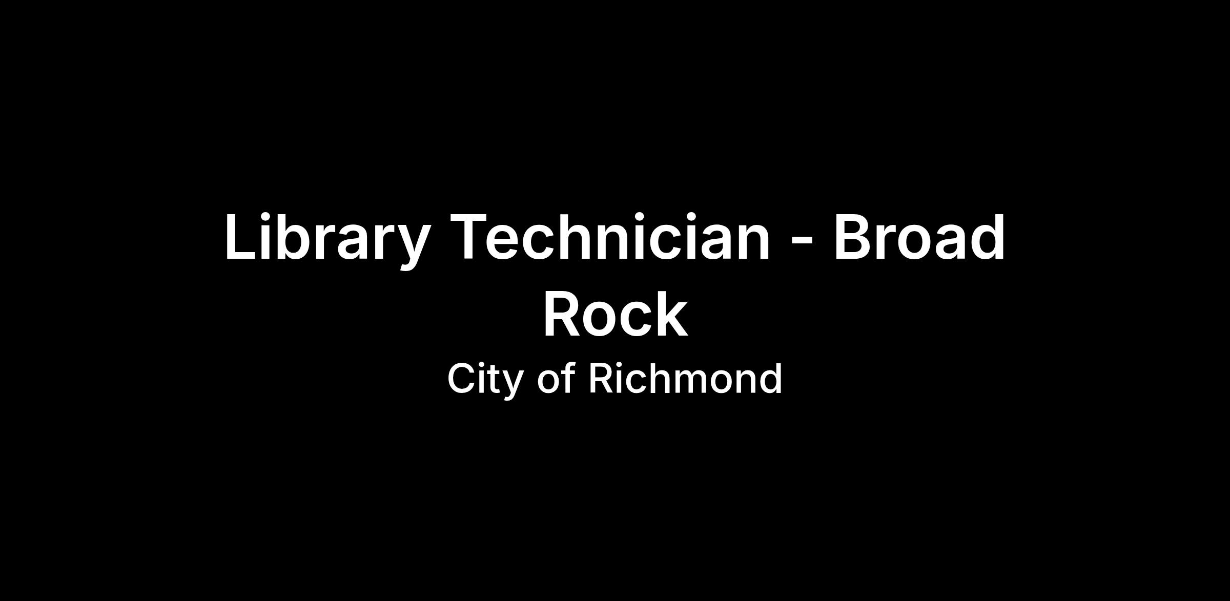 The City of Richmond Public Library seeks a dynamic, enthusiastic, and hardworking person to join its team as an entry level Library Technician at the Broad Rock Branch. The incumbent will be a self-motivated individual who is an excellent communicator, team player, problem solver, and most importantly, exudes exceptional customer service. The selected candidate will join a dynamic team of individuals focused on providing excellent, prompt, and accurate services to both external and internal customers while achieving the library’s mission to Inform, Enrich, Empower.