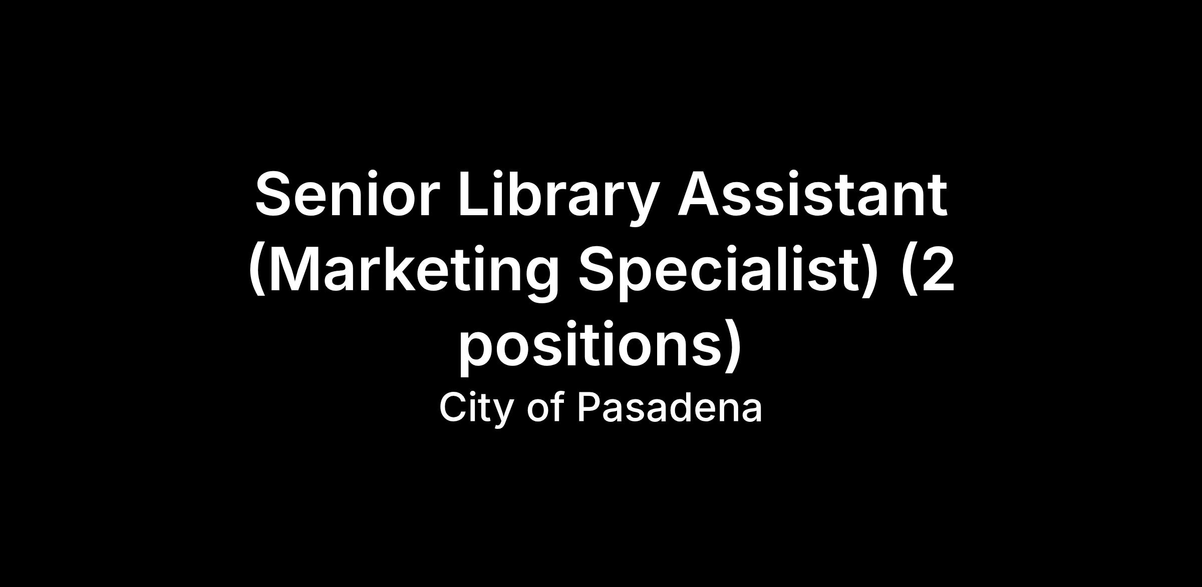 Duties: The Senior Library Assistant (Marketing Specialist) performs advanced professional work developing, coordinating, and implementing strategic marketing and communications initiatives that promote Pasadena Public Library services, programs, and community impact. Working in a diverse environment, this position helps fulfill the mission, vision, and values of the Library and the City of Pasadena by strengthening public awareness, engagement, and support for library services through integrated marketing strategies, digital communications, and community outreach. The Senior Library Assistant (Marketing Specialist) collaborates with library leadership, city communications staff, community partners, and internal teams to ensure consistent messaging, brand alignment, and effective promotion of library initiatives. Develops and implements marketing strategies that promote library services, programs, collections, and initiatives. Manages the library's digital presence including the website, social media platforms, newsletters, and other communication channels. Creates and coordinates marketing campaigns to increase public awareness, program attendance, and community engagement. Produces promotional materials including graphics, digital content, publications, and other marketing assets that align with City branding standards. Collaborates with library leadership and staff to identify promotional opportunities and communicate the value of library services. Coordinates marketing efforts across library locations to ensure consistent messaging and branding. Tracks and analyzes marketing metrics to evaluate campaign effectiveness and improve engagement. Supports community outreach initiatives and represents the library at community events and partnerships. Works with the City of Pasadena Communications Department to ensure marketing materials align with city policies and communication standards. Provides marketing support for major initiatives, special projects, and strategic priorities of the library. May assist with coordination of marketing budgets, promotional resources, and vendor relationships. Must be able to work evenings, weekends, and after regular business hours as necessary. Must have and maintain, without interruption, required certifications and licenses. Works assigned schedule and complies with the City's timekeeping and attendance policies. Performs other related duties as assigned.