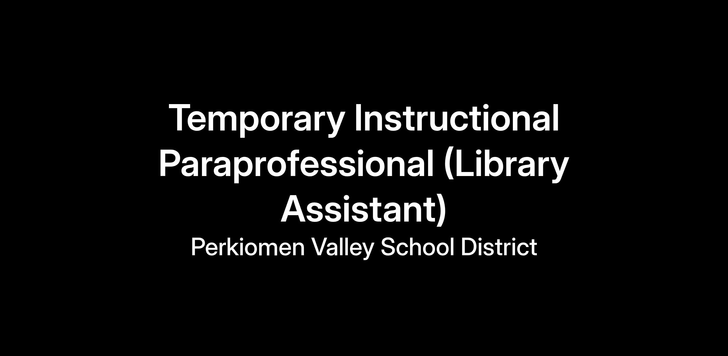The Perkiomen Valley School District is seeking a temporary instructional paraprofessional (library assistant) at Middle School East. This position is available immediately through the end of the 2025-26 school year. The hourly rate is $21.00 and the hours are 7:40 am - 3:10 pm.
